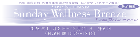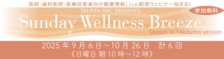 『Sunday Wellness Breeze』は、日頃抗加齢医療、予防医療、栄養療法などを手掛けられている医師、歯科医師、医療従事者を対象に、爽やかな微風が心地いいゆったりとした日曜日の朝、のんびりブランチでも食べながら新しい情報を気軽な気持ちで視聴できる医療のプロ向け健康情報ウェビナー(オンラインセミナー)です。Web会議アプリ「Zoom」を活用し、Liveで配信します。6回のウェビナーを1 Seasonとして開催して行きます。